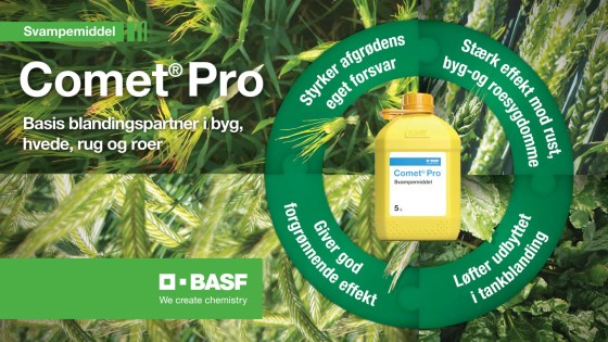 ”Comet Pro har effekt mod en lang række sygdomme i korn, desuden kan en behandling med Comet Pro i nogle tilfælde have en positiv indflydelse på udbyttet og/eller kvaliteten af den høstede afgrøde, selv om der ikke er synlige angreb af svampesygdomme.”
