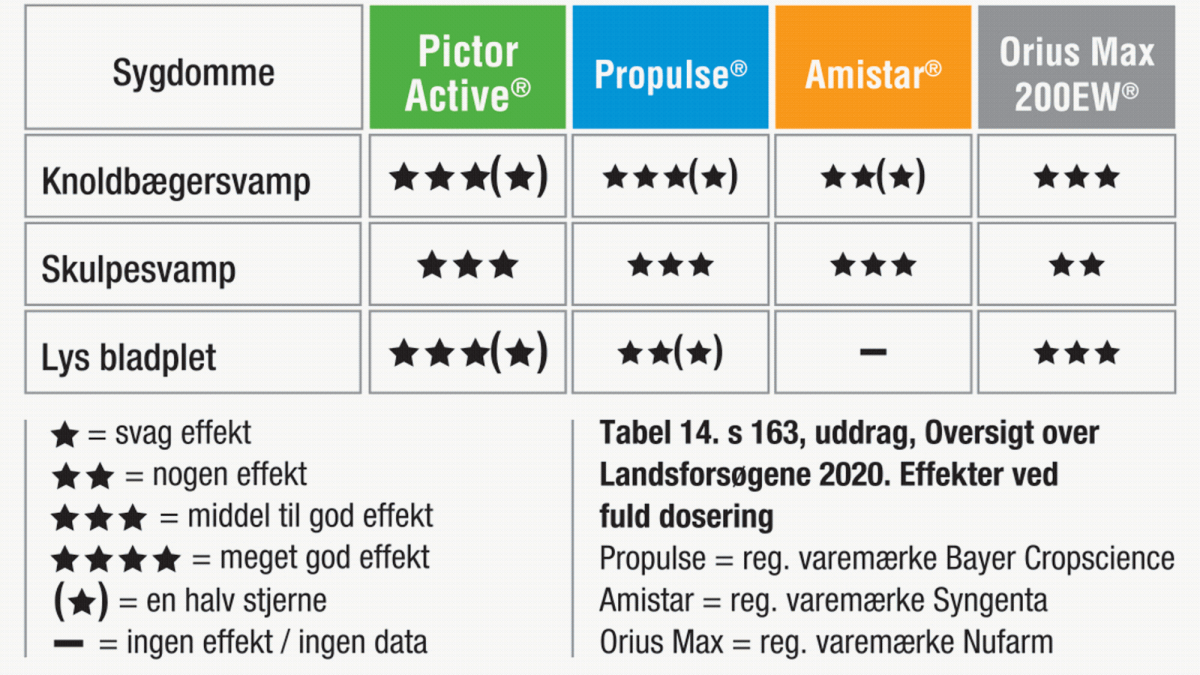 | Lavt smittetryk Stadie 65: 0,5 l/ha Pictor Active Middel smittetryk Stadie 65: 0,7-1,0 l/ha Pictor Active Højt smittetryk Stadie 63-65: 0,5 l/ha Pictor Active + 10-14 dage: 0,5 l/ha Pictor Active |