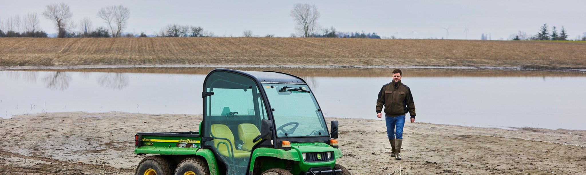 Ude i marken er der så meget mudder, at den sekshjulede ATV tages i brug for at komme frem. Drænene kræver et betydeligt serviceeftersyn, for et eller andet sted er der en prop, der forhindrer vandet i at løbe væk.
