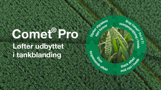 ”Comet Pro har effekt mod en lang række sygdomme i korn, desuden kan en behandling med Comet Pro i nogle tilfælde have en positiv indflydelse på udbyttet og/eller kvaliteten af den høstede afgrøde, selv om der ikke er synlige angreb af svampesygdomme.”
